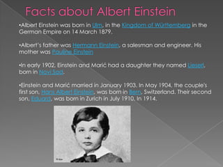 Albert Einstein was born in Germany in 1879 and went on to become one of the most influential physicists of the 20th century. In his "miracle year" of 1905, he published four groundbreaking papers, including his special theory of relativity containing his famous equation E=mc2. He was awarded the Nobel Prize in Physics in 1921 for his services to theoretical physics. Later in life, Einstein immigrated to the United States and took a position at the Institute for Advanced Study in Princeton, New Jersey. He died in 1955 at the age of 76.
