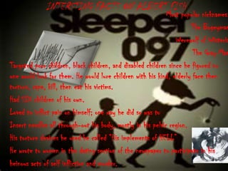 Albert Fish was a serial killer and cannibal nicknamed "The Werewolf of Wisteria" and "The Gray Man" who targeted poor, black, and disabled children in the early 20th century. He would lure children with his kindly appearance and then torture, rape, kill, and eat his victims. Fish had a history of mental illness in his family and suffered abuse as a child. He took pleasure in inflicting pain on himself and others. He was eventually caught and executed after writing a letter describing his murder of 10-year-old Grace Budd, which her mother recognized as being in his handwriting.