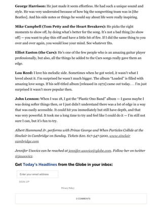 Albert Hammond Jr., guitarist for The Strokes, identifies five guitarists that have influenced his writing style: George Harrison for his unique sound and inspiring philosophical musings, Mike Campbell for knowing when to show off or serve the song, Elliot Easton for giving The Cars an edge with his playing, Lou Reed for his melodic side and underrated album "Loaded", and John Lennon's album "Plastic Ono Band" for its immediate emotional impact and depth. Hammond Jr. will perform at the Sinclair in Cambridge on Sunday.