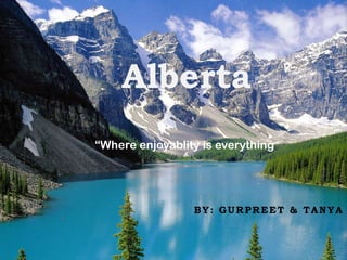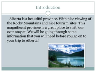 Alberta is a beautiful western Canadian province known for its Rocky Mountains and vast tourism opportunities. It has a population of 3.99 million people and its diverse landscapes include the mountainous western cordillera, interior plains, Canadian Shield, and grasslands in the south. Alberta experiences a continental climate with mild summers and cold, snowy winters. There are many national parks and recreational activities to enjoy, especially skiing, hiking, and wildlife viewing. The province's two most famous national parks are Banff and Jasper, located in the Rocky Mountains.