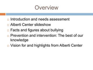 The document provides an overview of research on preventing bullying abuse and school violence. It discusses facts and figures about bullying including prevalence, types, gender differences, and consequences. It also discusses prevention and intervention strategies including developing anti-bullying policies, training staff, working with parents, responding to incidents, and ongoing support. Effective anti-bullying programs are intensive, carefully monitored, and include parent training. Brief awareness events and zero-tolerance policies are less effective. The Alberti Center conducts research to understand and reduce bullying through providing research-based tools.