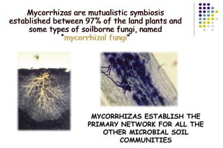 The document discusses mycorrhizas, a mutualistic relationship between most land plants and mycorrhizal fungi, highlighting their role in nutrient absorption and benefits to plant growth. It details the physiological aspects of arbuscular mycorrhizal fungi, including their cultivation, applications, and comparative advantages of a new gel-type inoculant known as 'mycogel' over traditional methods. Additionally, various research trials demonstrate mycogel's effectiveness in enhancing crop yields and plant resilience under stress conditions.