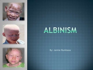 This document discusses albinism, a congenital disorder characterized by little or no pigmentation in the skin, hair and eyes. It is caused by a recessive gene that results in a lack of the enzyme tyrosinase needed to produce melanin. There are different types of albinism that can affect the eyes only or eyes, skin and hair. Albinism is associated with vision defects like photophobia, nystagmus and astigmatism as well as sun sensitivity. Diagnosis involves genetic testing or eye exams. Treatment focuses on protecting the skin from sun exposure and addressing vision problems. The condition does not affect lifespan except in rare cases of associated disorders.