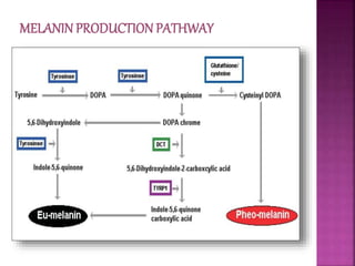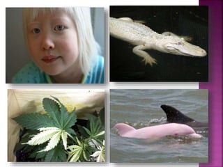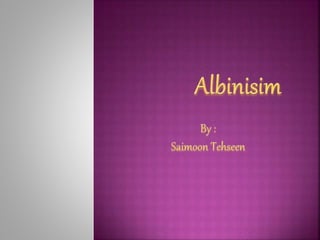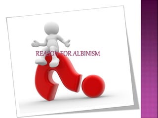Albinism is a hereditary condition caused by a lack of melanin pigment in the skin, hair, and eyes. It results from a recessive gene and causes little to no pigmentation, making skin and hair very light in color and eyes often red or blue. Symptoms include light sensitivity, vision problems, and nystagmus. There are different types of albinism that vary in severity based on the amount of residual melanin present. Proper sun protection and sunglasses are important to manage health issues associated with albinism.
