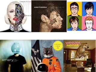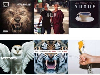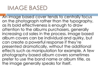 The document discusses trends in album artwork, including image-based covers that focus on a central photograph to draw attention, portrait covers that are popular for solo artists as it establishes their presence, photo manipulation covers that are bold and convey information about the artist's personality or message, type-based covers where the band or album name in large fonts makes it recognizable, and minimalistic covers that appeal to purchasers with open space but risk being too simple.
