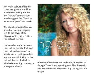 This document analyzes and compares the album covers of Taylor Swift from her debut album to her most recent release. It discusses how her style has matured over time while still maintaining some consistent elements. For example, her shoulders are often bare, she doesn't make direct eye contact with the camera, and she uses the same font for her name. The document examines themes, costumes, backgrounds, and other design elements to understand how Taylor's image and branding have evolved as her target audience has grown older.