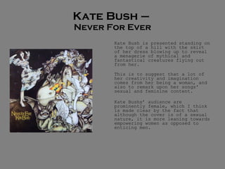 The album cover features Kate Bush standing on a hill with her dress blowing up, revealing mythical creatures flying out of her dress, suggesting her creativity comes from being a woman and the sexual/feminine nature of her songs.