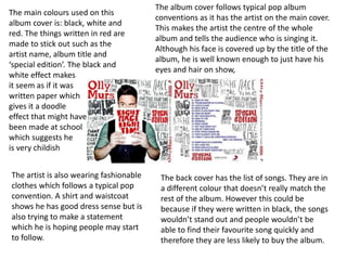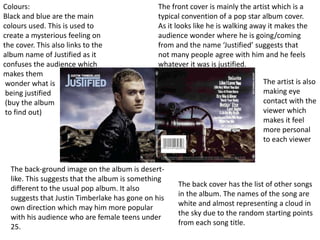 The album cover uses black and blue to create a mysterious feeling, linking to the album title "Justified" and making the audience wonder what is being justified. The artist is pictured walking away, causing the audience to wonder where he is going. Song titles on the back cover are placed randomly like clouds. The background image of a desert suggests the album is different from typical pop albums and that the artist has gone in his own direction.
