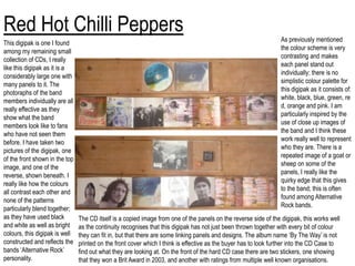 This document discusses and analyzes several music album digipaks, including those for Red Hot Chili Peppers, Gorillaz, and Katy Perry. For the Red Hot Chili Peppers digipak, it notes the use of contrasting colors and close-up band images. The Gorillaz digipak features the band's cartoon characters against a simple white background. Finally, the Katy Perry digipak ties into her California Dreams tour through its candy-inspired visuals and inclusion of the artist herself.