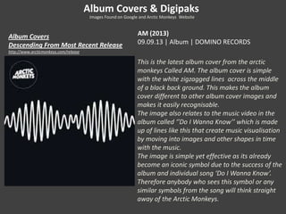 The document summarizes the album covers of several albums by the Arctic Monkeys in chronological order. It describes the simple yet effective designs that became iconic symbols, including AM (2013) with its white zigzagged lines on black, Suck It and See (2011) with a plain white background highlighting the bold title, and Humbug (2009) featuring a hazy image suggesting drug influence. It also discusses the designs relating to the bands' style and helping the albums stand out on store shelves. Across the albums, common design elements include monochrome color schemes, distorted or non-linear text, and imagery connecting to the bands' music videos or urban influences.