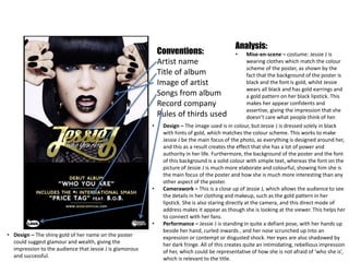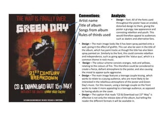 The document analyzes several album cover designs using conventions of design, mise-en-scene, camerawork, and performance. It summarizes the Green Day album cover by noting the distressed fonts, spray painted title, rebellious color scheme and image of a teenage couple. For the Jessie J poster, it describes her all-black outfit matching the color scheme, close-up camera angle showing her defiant pose and lipstick details, and shiny gold name suggesting glamour. The System of a Down cover is summarized as using a distressed font, direct address from the tribal image, mysterious date style and labels informing of content and purchase options.