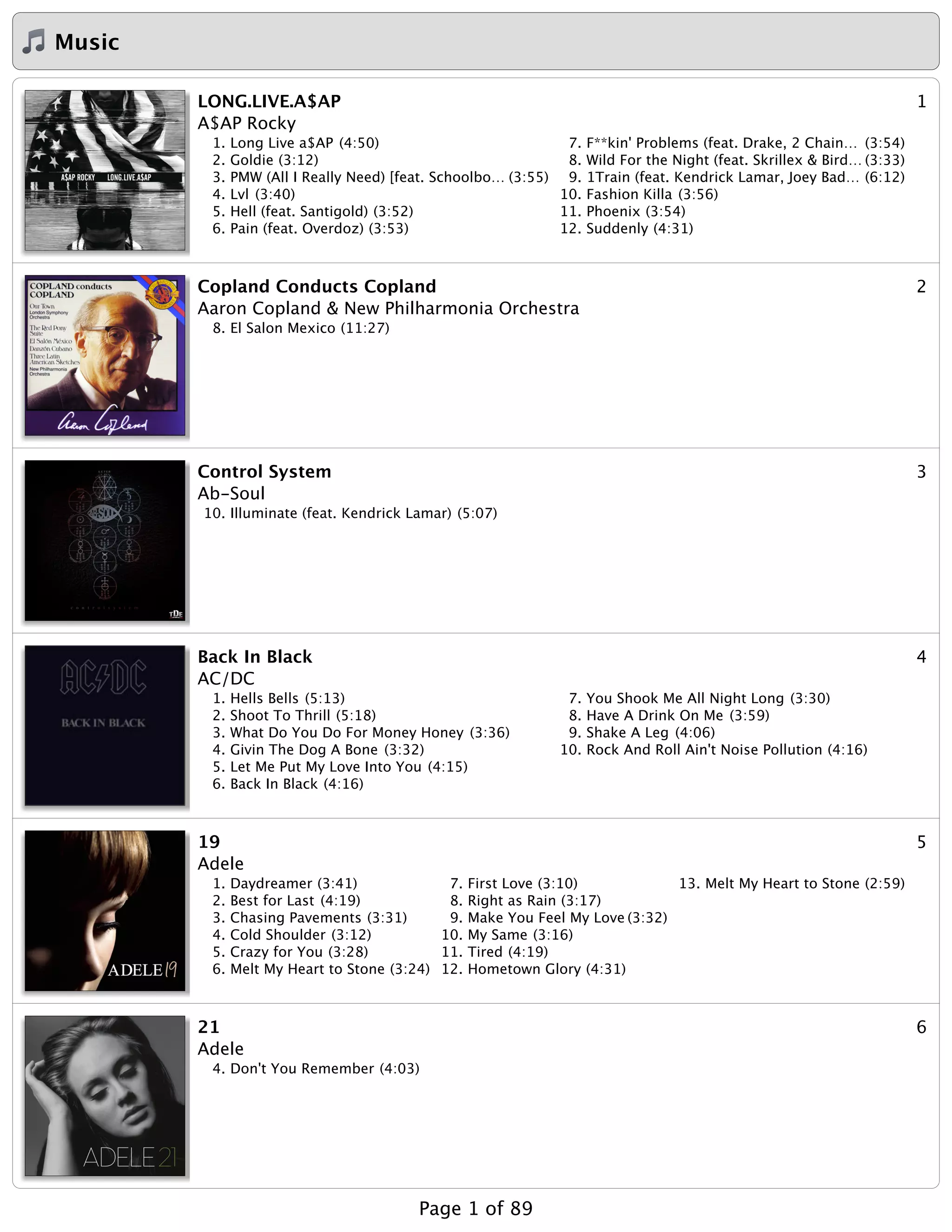 This document provides a list of music albums and tracks. It includes albums from various artists across different genres, such as A$AP Rocky, AC/DC, Adele, Amy Winehouse, Animals, Arcade Fire, Arctic Monkeys, Aretha Franklin, Ariana Grande, Avenged Sevenfold, and others. Individual tracks are listed for each album along with artist, album title, track title, and track length. The list continues over multiple pages and includes classical works by Schubert as well.