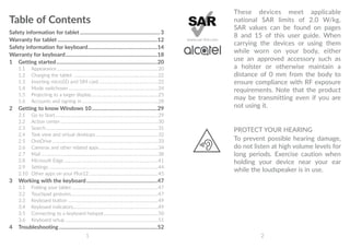 This document provides safety information, warranty details, and instructions for using a tablet and keyboard. It covers topics such as charging the tablet, inserting SIM and microSD cards, switching between modes, projecting the tablet's display to another screen, setting up accounts, navigating the Windows 10 interface, using apps like Mail and Edge, and adjusting settings. Troubleshooting tips are also included.
