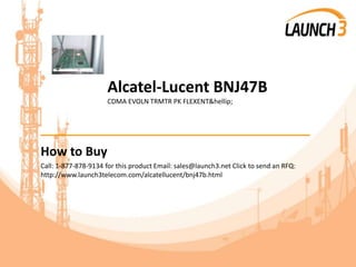 This document provides information about the Alcatel-Lucent BNJ47B CDMA EVOLN TRMTR PK FLEXENT transmitter card. It can be purchased from Launch 3 Telecom for CDMA networks and connects to an BNJ48B EVR card with an SCSI cable in an Alcatel-Lucent MOD 4 chassis. The document describes payment and shipping options for purchasing the item from Launch 3 Telecom and their repair, maintenance and other telecom services.