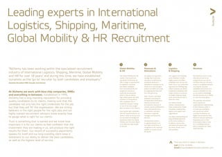 The document summarizes the services provided by Alchemy Recruitment for several specialized sectors including logistics and shipping, maritime, global mobility and HR, removals and relocations. Alchemy has over 18 years of experience recruiting candidates worldwide for positions in these industries. They work with both large corporations and SMEs to source qualified candidates and ensure good job fits.