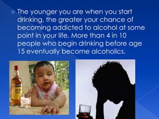 Starting alcohol use at a young age significantly increases the risk of alcoholism later in life. Alcohol is also a leading cause of death among teenagers due to traffic accidents and other injuries, and nearly one third of high school students report hazardous binge drinking according to surveys. Traffic crashes, where alcohol is a factor, are the greatest cause of death for people aged 6 to 33 years old.