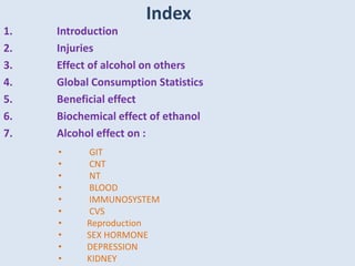 The document discusses the diverse effects of alcohol, including its impact on health, society, and addiction. It highlights the risks associated with alcohol consumption such as injuries, violence, and various health complications affecting multiple body systems. While some beneficial effects of moderate alcohol consumption are mentioned, the overall tone emphasizes the significant negative consequences and importance of addressing alcohol-related issues.