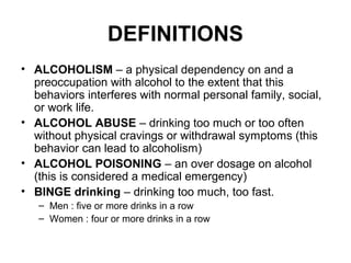 The document defines various alcohol-related terms like alcoholism, alcohol abuse, binge drinking, and blood alcohol concentration. It explains that beer, wine, and liquor contain equal amounts of alcohol despite different volumes. Various factors can influence how alcohol affects someone, including body size, gender, food consumption, and drug use. Ultimately, the only thing that determines how drunk someone is their blood alcohol content, which is measured using a standard scale ranging from euphoria to loss of motor control to risk of death at high levels.