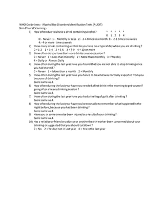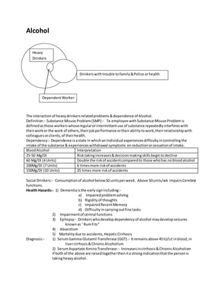 This document discusses alcohol use and misuse in the workplace. It defines substance misuse problems as regular or intermittent substance use that interferes with work performance or relationships. Dependence is difficulty controlling intake and withdrawal symptoms when reducing intake. The document provides blood alcohol concentration levels and associated accident risks. It lists some health hazards of heavy drinking like dementia and seizures. Diagnosis of alcoholism can involve liver enzyme tests. The WHO AUDIT screening test is described to assess alcohol use disorders.