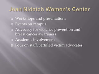 The document discusses workshops and advocacy provided by the Jean Nidetch Women's Center and P.A.A.V.E. on topics related to violence prevention and breast cancer awareness. It provides definitions and statistics on sexual assault, domestic violence, and alcohol-facilitated sexual assault. It discusses issues of consent, the effects of intoxication on one's ability to consent, and the long-term impacts victims may experience. Resources for victims of interpersonal violence are listed.
