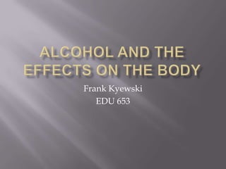 Alcohol affects many parts of the body. It initially causes an energizing effect but is actually a depressant that slows the central nervous system. As more alcohol is consumed, it impairs judgment, motor skills, and can lead to intoxication or even loss of consciousness. The liver works to break down alcohol but drinking too much overwhelms this system. Long term heavy use can damage the liver and brain. Fetal alcohol syndrome may also result if a pregnant woman drinks.