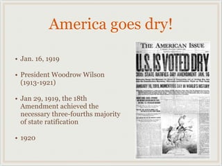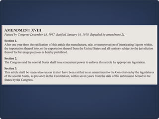 The 18th Amendment, ratified on January 29, 1919, enacted nationwide prohibition of alcohol in the United States, empowering both federal and state enforcement without clear definitions or penalties. Prohibition led to significant issues, including a rise in organized crime and a black market for alcohol, resulting in public discontent and illegal production. Ultimately, the national prohibition ended with the 21st Amendment on December 5, 1933, with Mississippi being the last state to lift it in 1966.