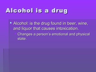 AAllccoohhooll:: iiss tthhee ddrruugg ffoouunndd iinn bbeeeerr,, wwiinnee,,