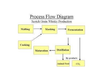 The document discusses various types of alcoholic beverages and their production processes. It describes how yeast converts sugars into ethanol and carbon dioxide during fermentation. The key steps common to many alcoholic beverages include converting plant starches to sugars, adding yeast to ferment the sugars, and sometimes distilling the fermented beverage to increase alcohol concentration. Production charts are provided for wine, beer, brandy, and vodka to illustrate the specific steps involved in each type of beverage.