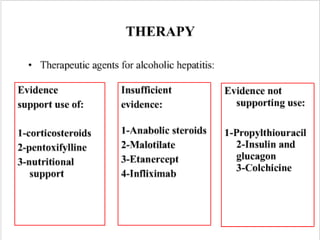 This document discusses alcoholic liver disease (ALD). It notes that ALD ranges in severity from fatty liver to alcoholic hepatitis to cirrhosis. Risk factors include the amount of alcohol consumed daily and genetically. Diagnosis involves blood tests like GGT and liver biopsy. Severe alcoholic hepatitis has high short-term mortality and is treated with corticosteroids or pentoxifylline to reduce inflammation. Prognosis can be predicted using scores like Maddrey DF and management involves lifestyle changes like abstaining from alcohol and adequate nutrition.