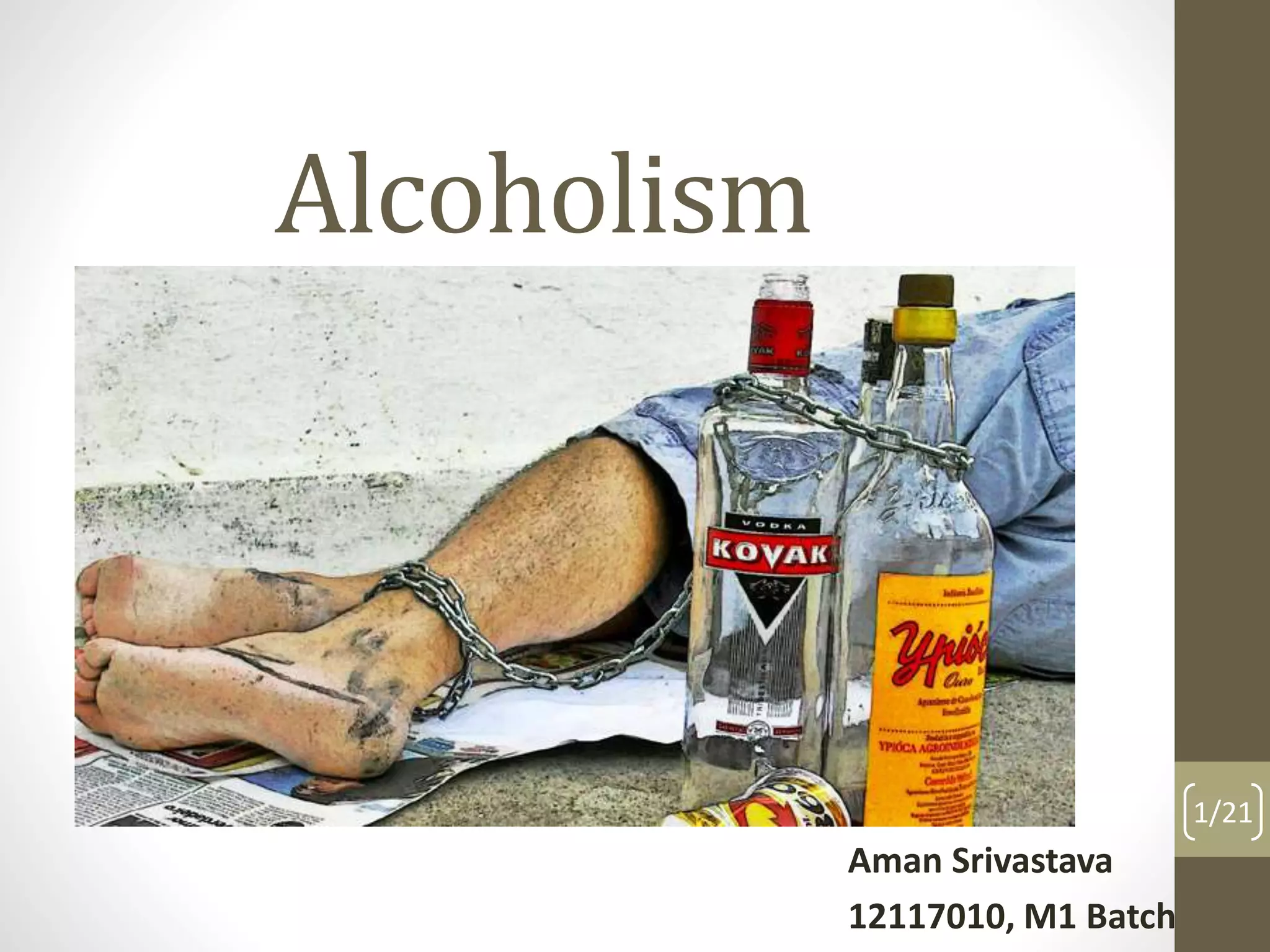The document discusses alcoholism, including what it is, its health effects on the brain, liver, pancreas and stomach, and the social problems associated with it. It provides details of a case of a woman who drank and drove, and discusses why people drink alcohol, the cycle of alcoholism, and how to quit drinking alcohol by admitting it's a problem, getting help from others, changing attitudes and rewarding progress. It also mentions Alcoholics Anonymous and its role in helping people achieve sobriety.