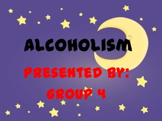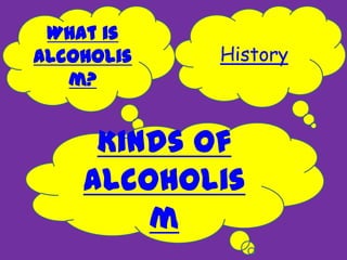 This document discusses alcoholism, including its definition, types, history, symptoms, causes, effects on the human body, and how to determine if someone may be alcoholic. Alcoholism is defined as a chronic disease characterized by control problems with alcohol use and continued drinking despite negative consequences. There are several subtypes of alcoholism described in the document. The causes are complex but include genetic and environmental factors. Symptoms include craving, loss of control, tolerance, and withdrawal. Effects on the body can impact the brain, psychological health, and increase risk of diseases. The social impacts of alcoholism are also outlined.