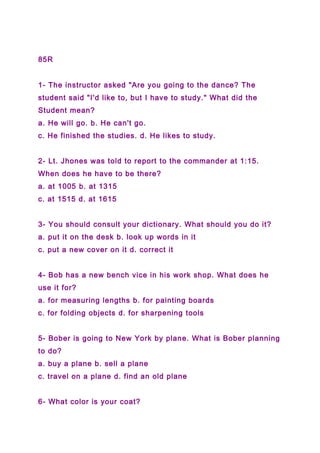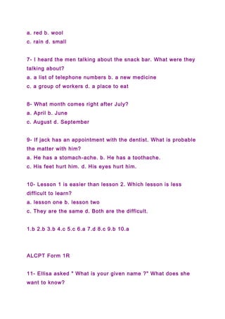 The document contains 100 multiple choice questions from an English language proficiency test. The questions cover topics such as grammar, vocabulary, reading comprehension, and dialog comprehension. For each question, the test-taker is to select the best answer among 4 options (a, b, c, or d) based on the information provided in the question or short passage. The document provides the questions, answer options for each, and then lists the correct answers at the end.