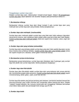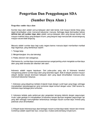 Dokumen tersebut membahas pengertian dan penggolongan sumber daya alam (SDA) di Indonesia. SDA didefinisikan sebagai sumber daya alam yang dapat dimanfaatkan untuk memenuhi kebutuhan manusia, baik benda mati maupun hidup. SDA di Indonesia dikelompokkan menjadi empat kelompok berdasarkan sifat, proses terbentuk, bagian yang dapat dimanfaatkan, dan kemampuan pembaruan. Indonesia kaya akan SDA hay