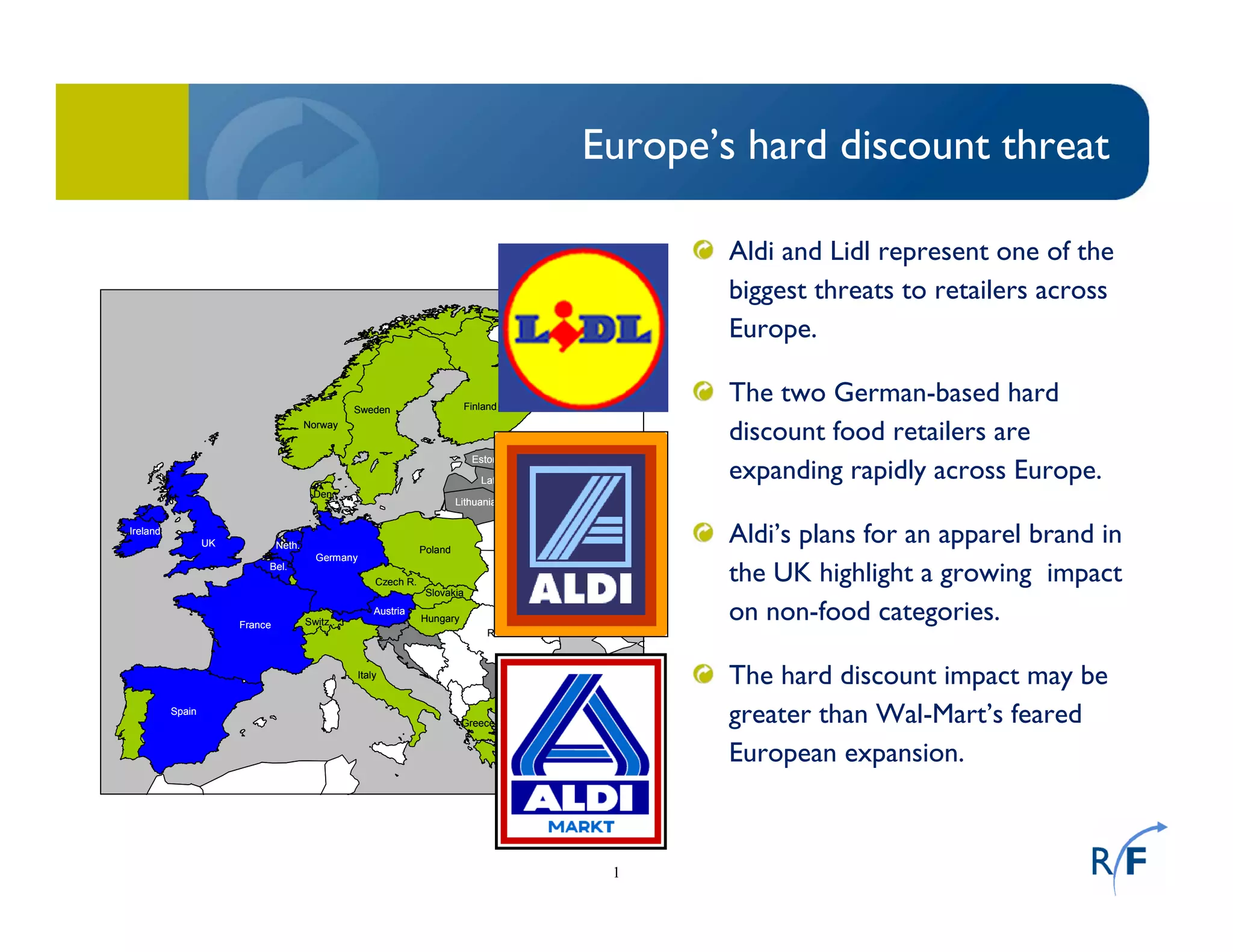 The document discusses the growing threat that European hard discount retailers Aldi and Lidl pose to other retailers across Europe and potentially worldwide. It outlines how Aldi and Lidl have been rapidly expanding across Europe through new store openings and geographic expansion. Their business model of offering a limited product assortment at very low prices has put pressure on other retailers and suppliers. The document examines Aldi and Lidl's operations and growth in different European countries and suggests their business approach could significantly impact retailers in other parts of the world as well.