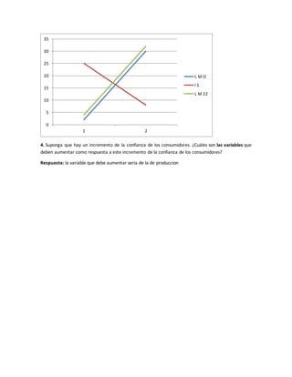 El documento describe cómo cambiarían las líneas IS y LM en respuesta a diferentes eventos económicos. Específicamente, dice que la línea IS no cambiaría y la línea LM descendería si hay una reducción en la confianza de los consumidores. También indica que la producción debería aumentar en respuesta a un incremento en la confianza de los consumidores.