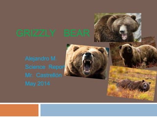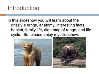 Grizzly bears once lived across western North America but now their range is limited to Alaska, Canada, Idaho, Montana, Wyoming and Washington. They have a hump of muscle on their back and males are called silvertip. Grizzly bears live in forests, mountains and coastlines and eat a varied diet including berries, salmon, and animal carcasses. Females raise their cubs in winter dens until the cubs are able to walk and feed themselves between ages 2-3 years old.