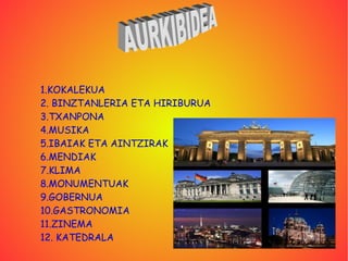 1.KOKALEKUA 2. BINZTANLERIAETA HIRIBURUA 3.TXANPONA 4.MUSIKA 5.IBAIAK ETA AINTZIRAK 6.MENDIAK 7.KLIMA 8.MONUMENTUAK 9.GOBERNUA 10.GASTRONOMIA 11.ZINEMA 12. KATEDRALA AURKIBIDEA