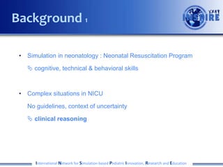This document discusses a study that aims to evaluate whether simulation-based training is an effective method for acquiring clinical reasoning skills in neonatology compared to traditional classroom training. The study will involve randomly assigning pediatric residents and neonatology fellows to either a simulation group or traditional training group. Both groups will complete pre- and post-tests involving multiple choice questions, script concordance tests, and clinical reasoning problem assessments to evaluate their clinical reasoning performance before and after their assigned training method. The researcher is seeking advice from INSPIRE on aspects of the study design such as whether a pre-test is necessary, how many topics should be covered in the training, and whether resources should be provided to participants.