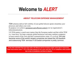 The document introduces A&B Groep's telecom expense management services, highlighting the importance of auditing and sourcing for effective telecom budget control. It discusses the prevalence of inaccuracies in telecom billing and the challenges organizations face in managing complex telecom expenditures. The services offered include contract audits, benchmarking, negotiation support, and a dedicated help desk for invoice-related issues.