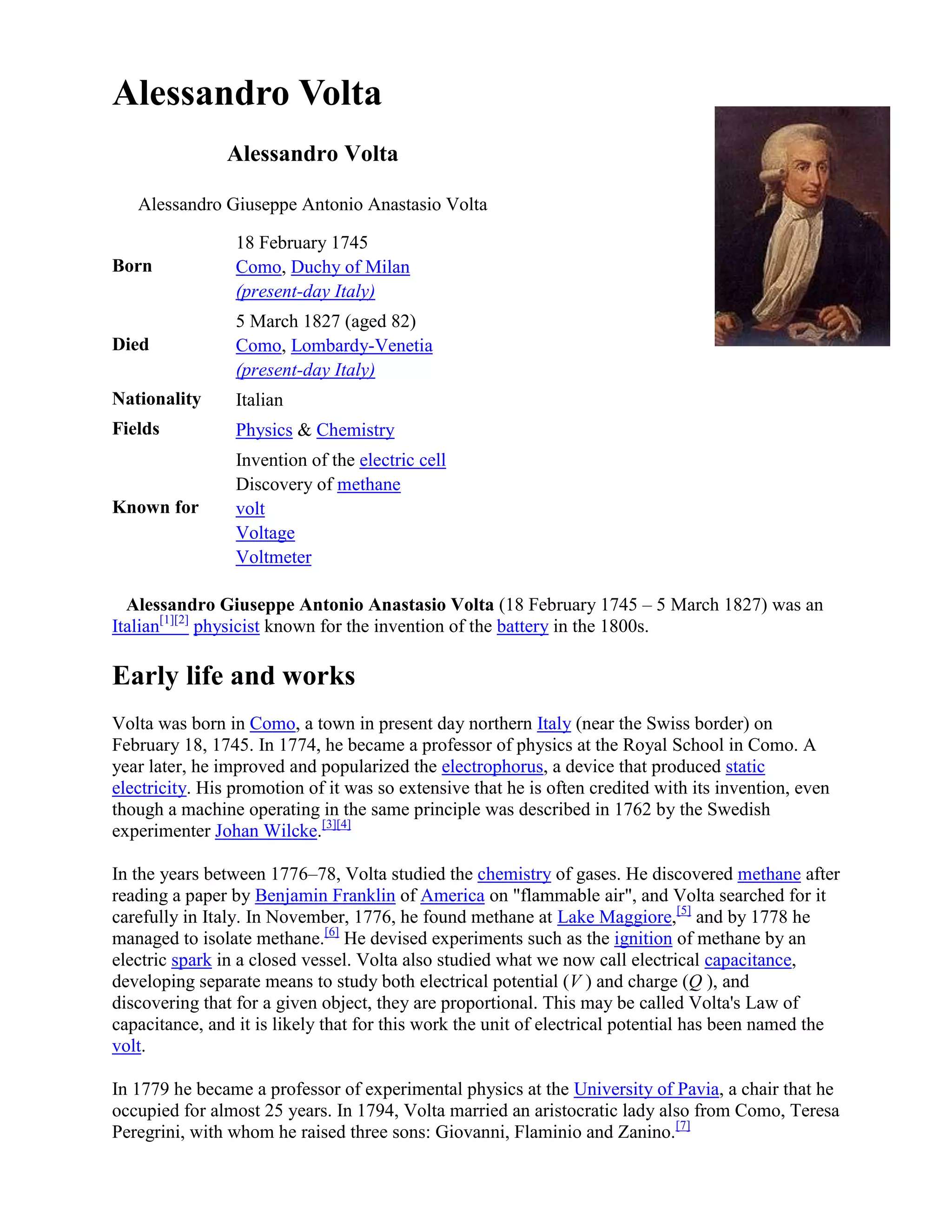 Alessandro Volta was an Italian physicist born in 1745 who invented the first battery called the "voltaic pile". Through experimenting with frogs legs and brine-soaked paper, Volta discovered that electricity could be generated through chemical reactions between two different metals such as zinc and copper separated by an electrolyte. He is credited with inventing the first electrochemical cell that produced a steady current of electricity. In honor of his work inventing the battery, Volta was made a count by Napoleon Bonaparte in 1801 and the unit of electrical potential is named after him as the volt.