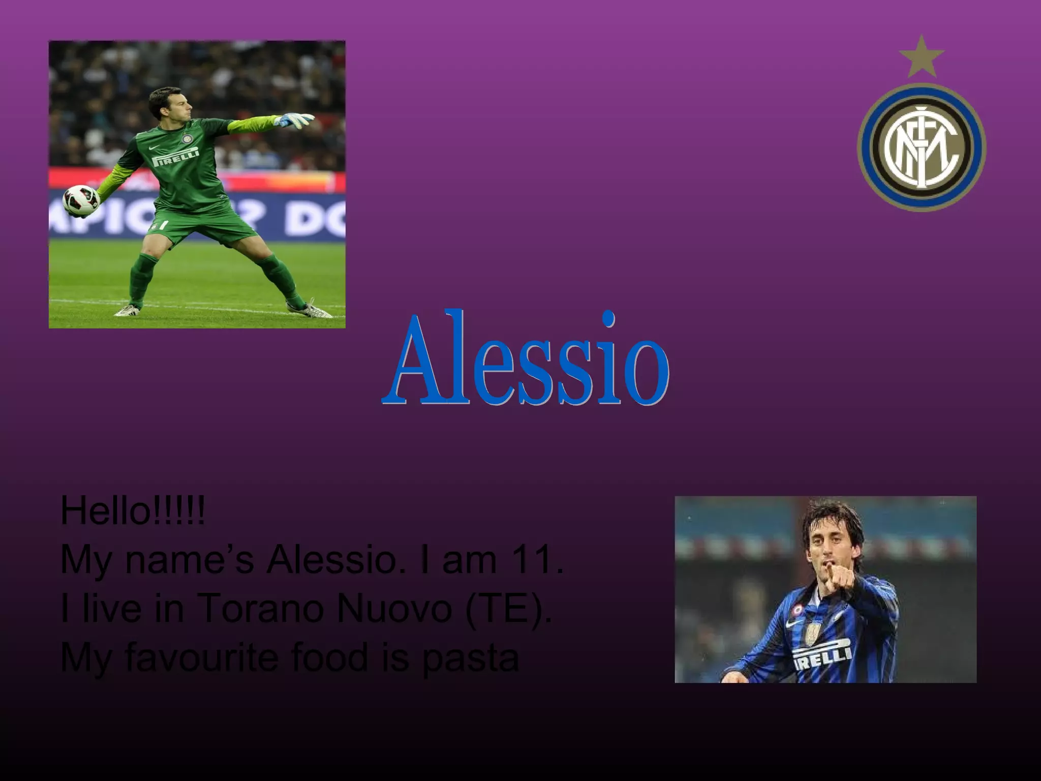 Alessio is an 11-year-old boy from Torano Nuovo who enjoys playing football for his local team and supporting INTER, eating pasta, meat and chips, and drinking cola and orangeade. His favorite animal is the wolf.