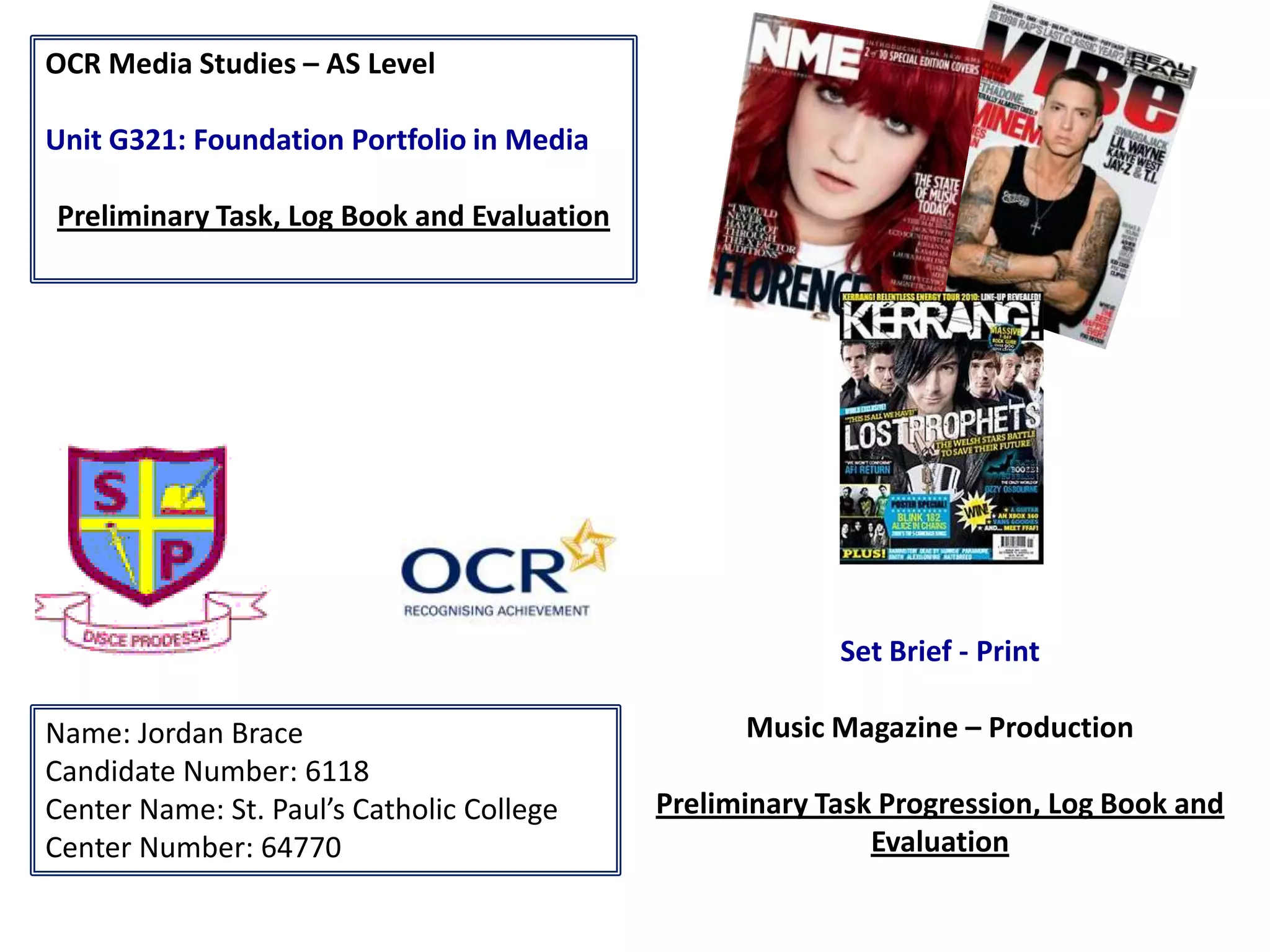 Jordan Brace created a music magazine for their school called SPC Magazine as a preliminary task. Their document outlines the 10 step process they took to create the front cover, including adding a banner, masthead, logo, website link, social media links, issue details, headlines, images and stories. It also describes the process of creating the contents page, including duplicating the masthead, adding features, an editorial box, stories, images and a byline. Jordan researched existing music magazines to understand conventions and target audiences to help design their own magazine.