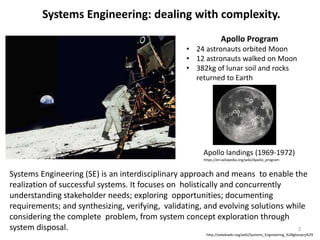 Systems engineering is an interdisciplinary approach that focuses on understanding stakeholder needs, exploring opportunities to meet those needs, and synthesizing and evolving solutions while considering the complete problem from concept to disposal. It deals with complexity by taking a holistic view. The Apollo program is an example of successful systems engineering, landing 12 astronauts on the moon and returning 382kg of lunar samples to Earth between 1969-1972. Systems engineering standards and documents provide guidance on structuring principles, life cycle processes, and architecture descriptions.