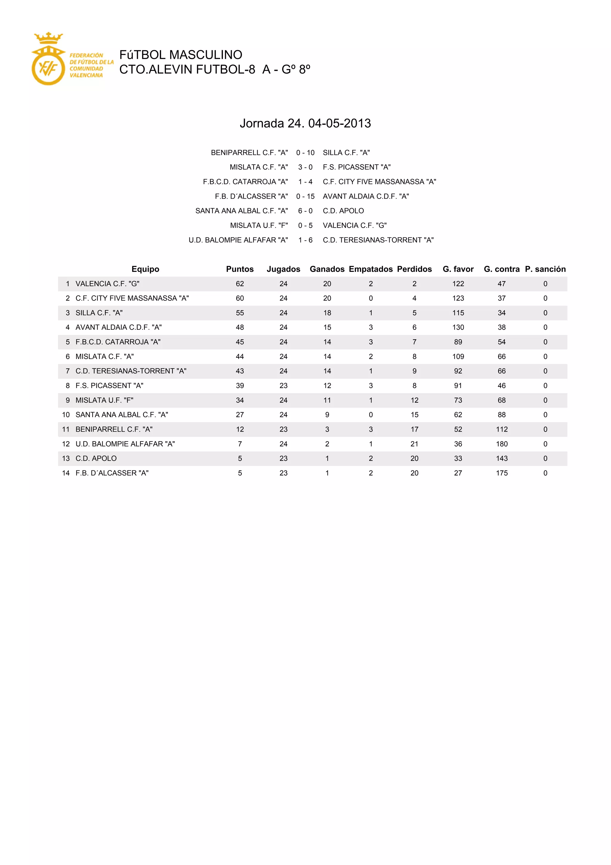 The document reports scores from matchday 24 of the boys' under-8 football league. Silla C.F. "A" defeated Beniparrell C.F. "A" 10-0, while Mislat C.F. "A" beat F.S. Picassent "A" 3-0. The league table shows Valencia C.F. "G" in first place with 62 points from 24 matches.