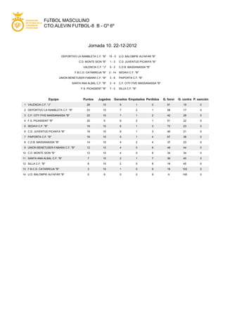 This document summarizes the results of the 10th matchday of the boys' football league Cto.Alevin Futbol-8 B - Go 6o. It includes the scores of the 7 matches played, the current league table showing points, games played, won, drawn, lost as well as goals for and against for each of the 14 teams. Valencia CF "J" sits atop the table with 28 points from 10 games.