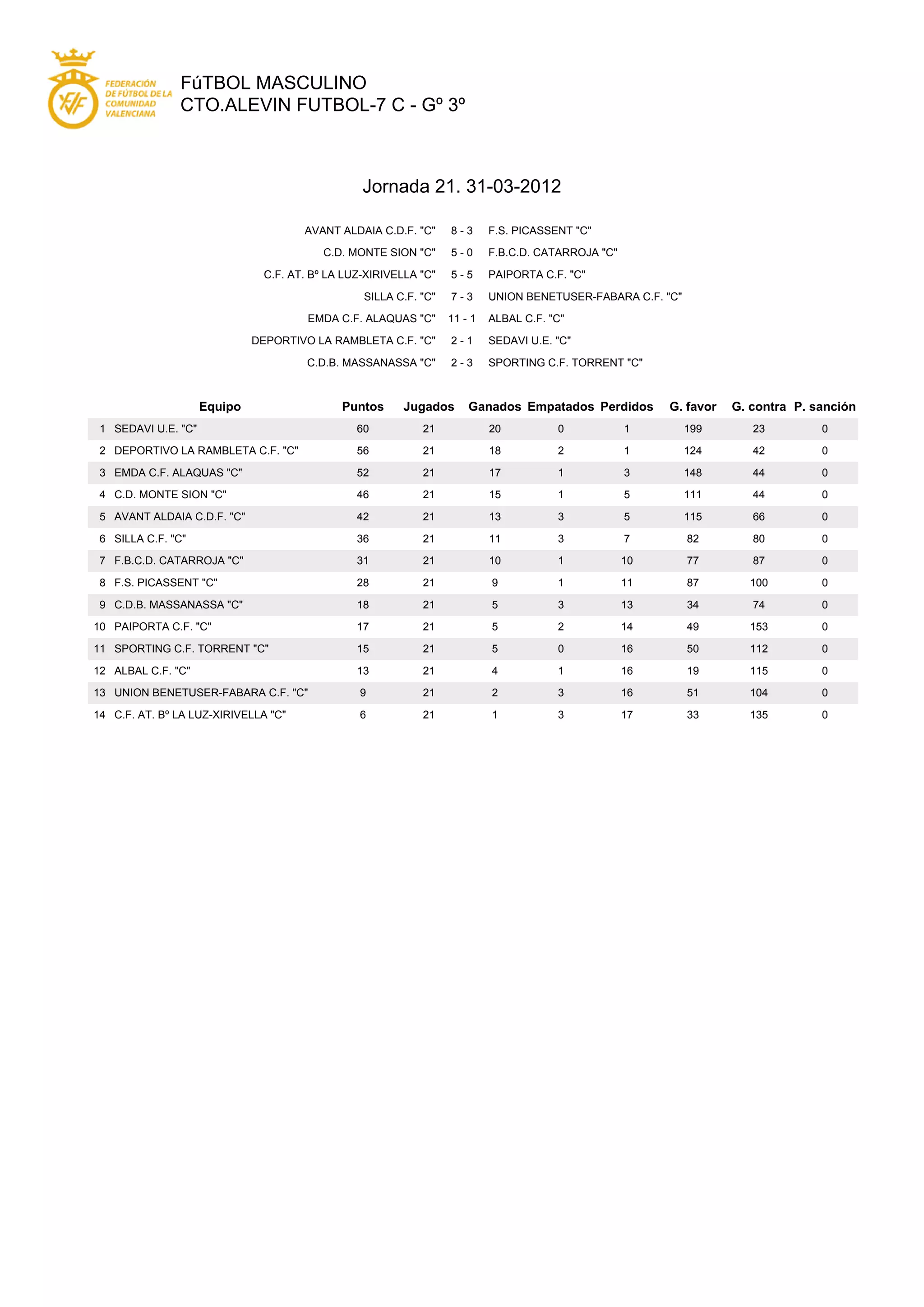 This document summarizes the results of the 21st matchday of the men's youth football league CTO.ALEVIN FUTBOL-7 C - Go 3o. It provides the scores of 7 matches played, as well as the current league table showing the points, games played, won, drawn, lost, goals for, goals against, and penalties for each of the 14 participating teams. Sedavi U.E. "C" sits atop the table with 60 points from 21 games played.