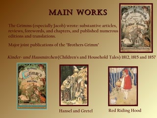 The document summarizes Grimm's Fairy Tales, a collection of folktales published in 1812 by Jacob and Wilhelm Grimm. It includes stories like Hansel and Gretel, Little Red Riding Hood, and Rapunzel. The Brothers Grimm published multiple editions, adding more stories over time. While intended for children, early volumes were criticized for not being suitable. The Brothers argued tales should be presented as close to the original, though they did modify some tales to remove violence in later editions. Grimm's Fairy Tales became their most remarkable work of fiction.