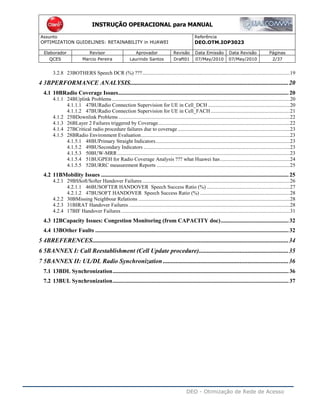 This document provides guidelines on optimization retainability in Huawei infrastructure radio access networks. It defines retainability as the probability that a service will continue once obtained under given conditions for a given time. The document outlines key performance indicators for retainability monitoring including retainability rate, dropped call rate for various service types, and minutes or drops per hour. It discusses factors impacting retainability such as mobility and coverage issues. Cause analysis for voice drops and configuration settings affecting retainability like cell update timers are also covered.