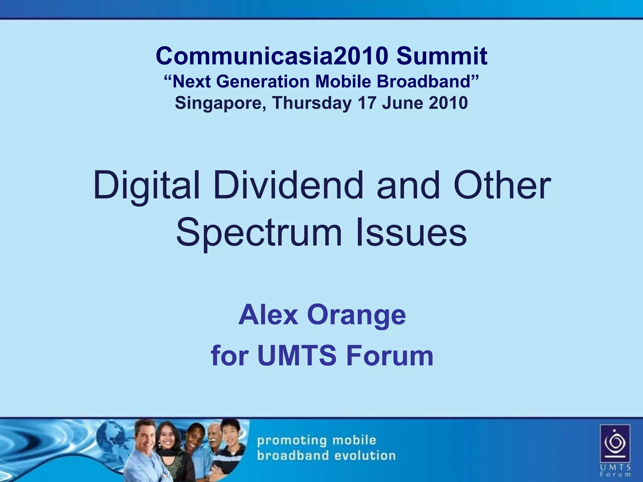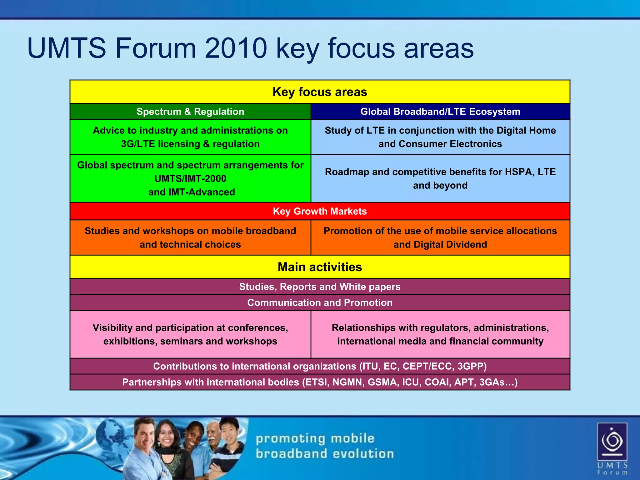 1) The UMTS Forum's key focus areas in 2010 include spectrum and regulation issues related to 3G/LTE licensing, global broadband ecosystems, and key growth markets.