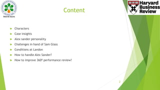 The document discusses Alex Sanders, a star employee and product manager at Landon Care Products who is struggling with a new 360-degree performance review system. Sanders' boss, Sam Glass, is challenged with how to manage Sanders' strong personality and channel his talents. The performance review lacks transparency and many employees distrust the process. Suggestions are provided for how Glass could improve managing Sanders, such as moving him to a solo role temporarily, as well as ways to enhance the transparency and usefulness of the 360-degree reviews going forward.